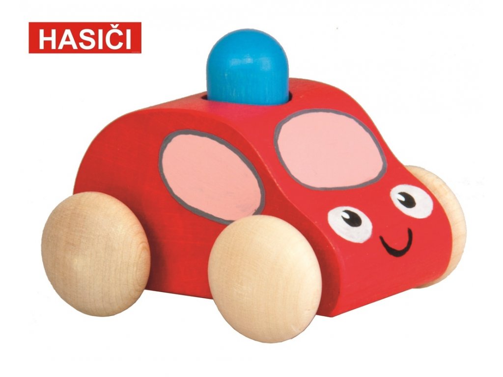 Malé dřevěné autíčko v červené barvě, které představuje HASIČSKÝ VŮZ s majáčkem, je určeno pro nejmenší děti, které lezou po čtyřech nebo už zvládají jednoduchou chůzi.